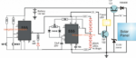Assim que o primeiro sinal é recebido do “sensor de tanque cheio de 3/4”, o astável é alimentado através do transistor 2N2222 relevante no canto superior esquerdo, e o circuito imediatamente começa a oscilar na taxa definida.